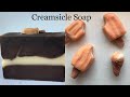 The making of dreamsickle fragranced, cold process soap, palm free recipe. A high vanilla fragrance, sweet, but discoloring. I knew that going in, so I planned my design accordingly. Here is a link to the blog post to find out more and get a link to the recipe: